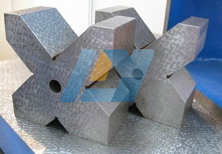 一般V型架都是一副两块,两块的平面与V型槽都是在一次安装中磨出的。V型架的尺寸相互表面间的平行度,垂直度误差在0.01毫米之内,V型槽的中心线在V型架的对称平面内并与底面平行,同心度,平行度的误差也在0.01毫米之内,V型槽半角误差在±30~±1范围内。V型架也可做划线,带有夹持弓架的V型架,可以把圆柱形工件牢固的夹持在V型架上,翻转到各个位置划线。
